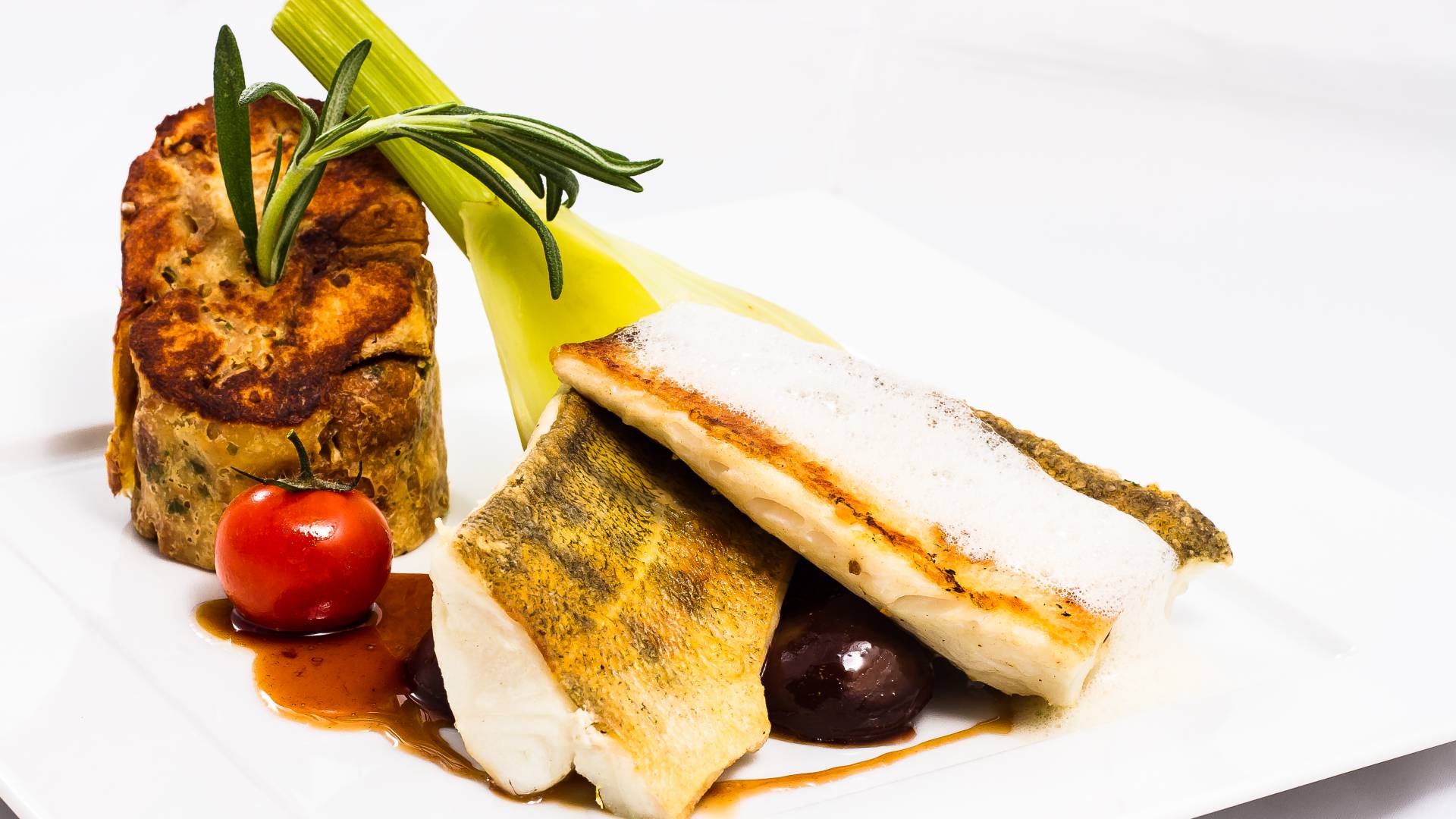 Ist der Fisch servierbereit (gegebenenfalls nocheinmal kurz im Ofen garziehen) und der Knödel schwimmt, richten wir an.
