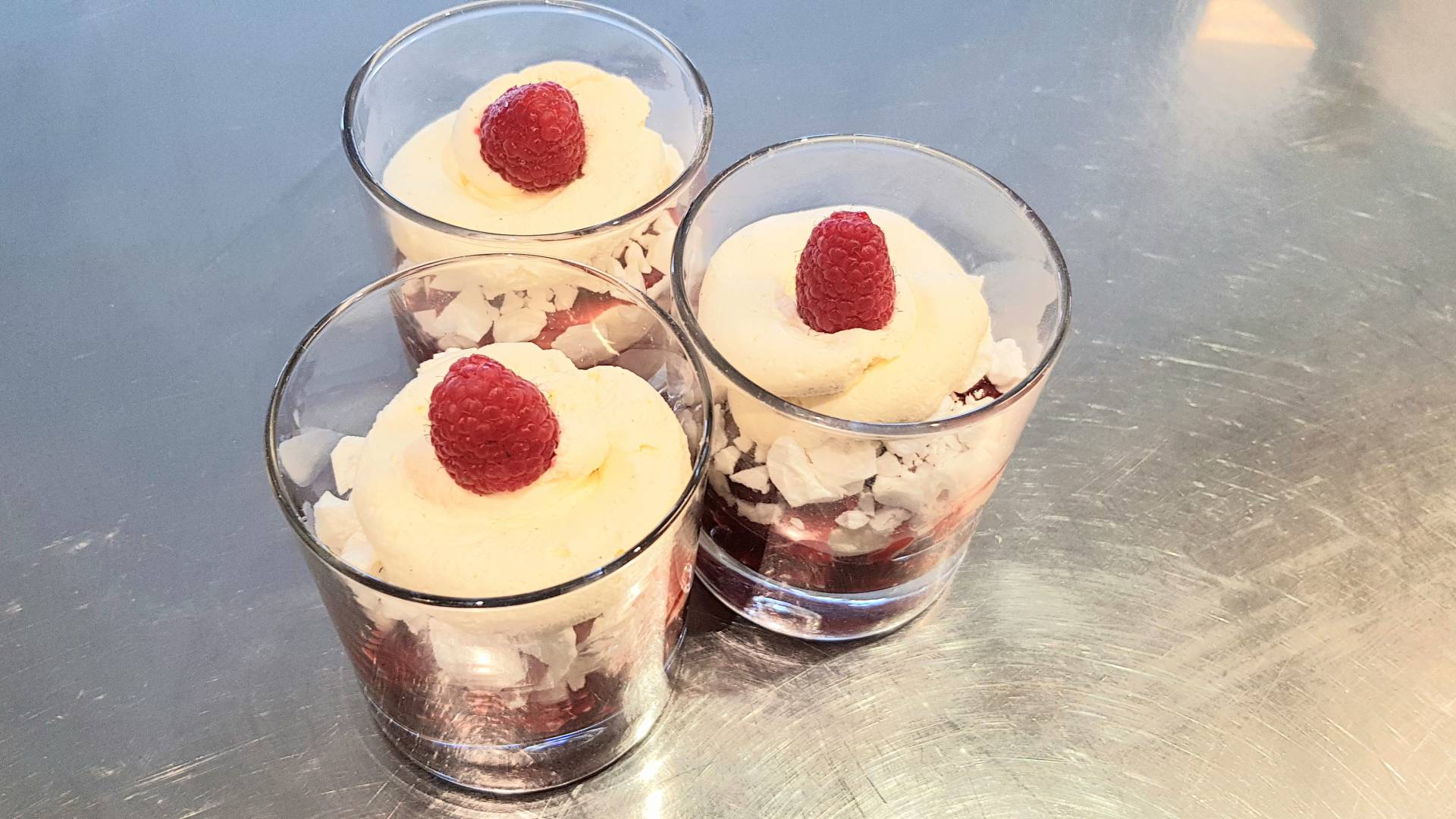 Schichten im Glas: Himbeeren, Baiser, Mascarpone, erneut Himbeeren, Baiser und Mascarpone
