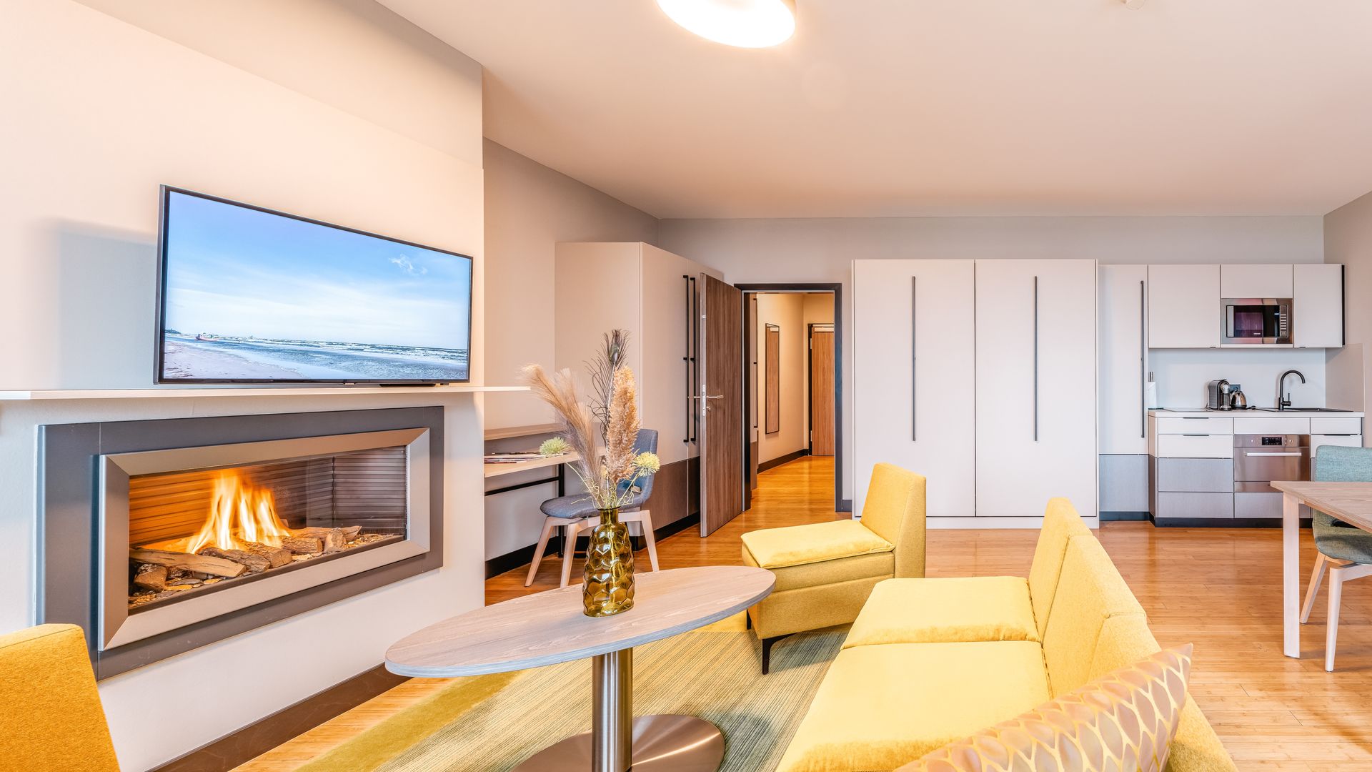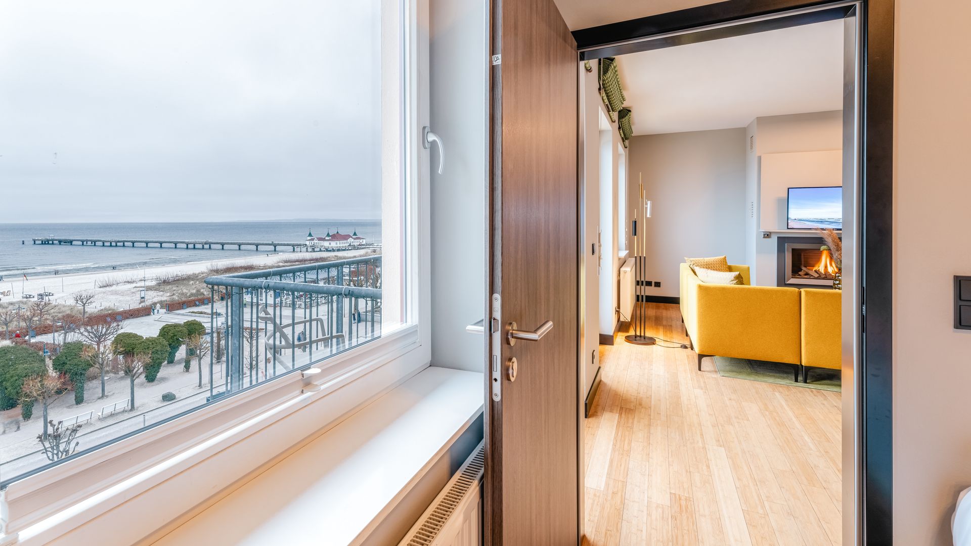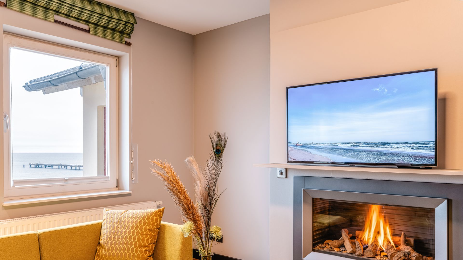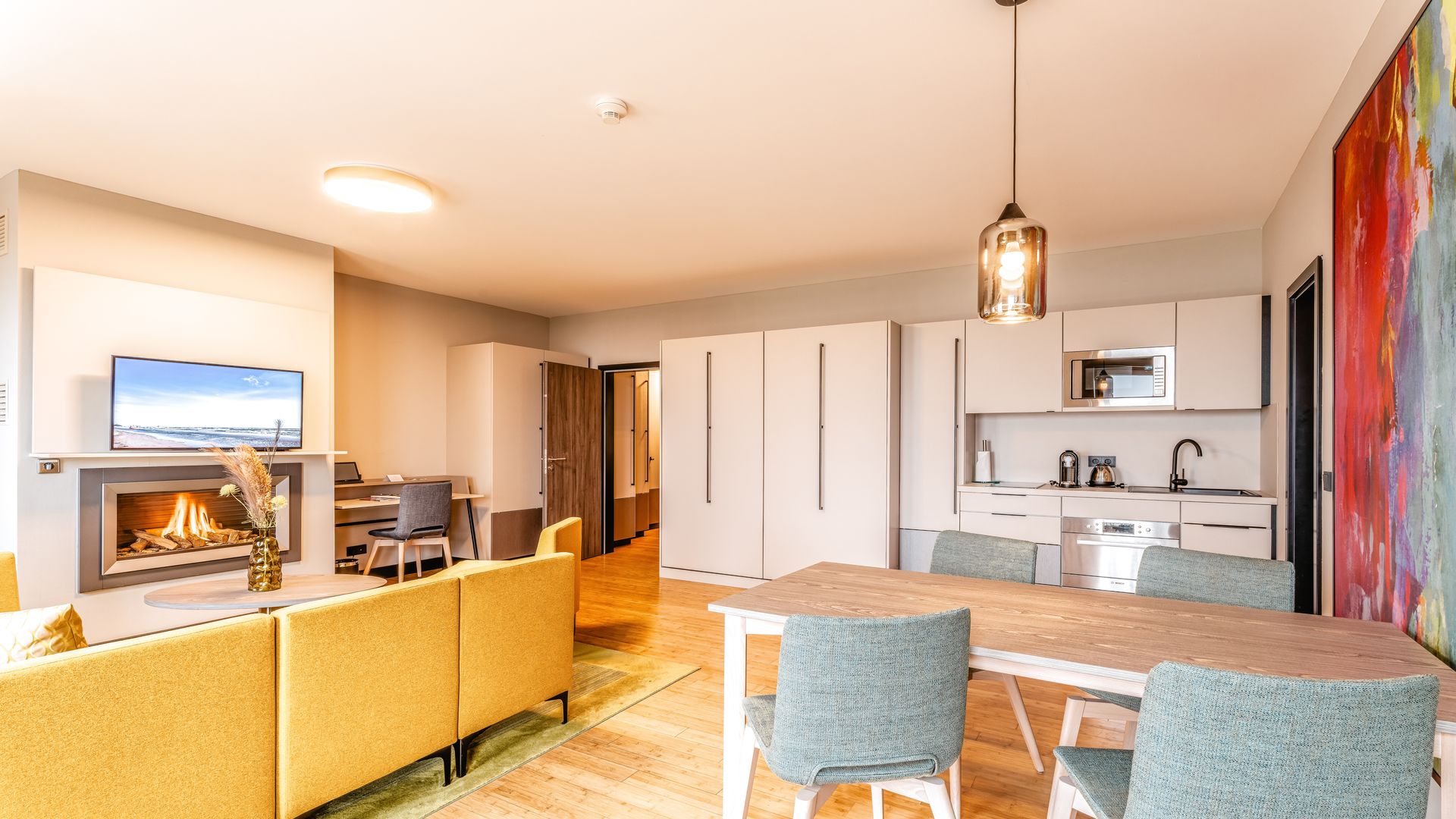 Ausstattung: Balkon mit Ostseeblick, Pantry-Küche mit Cerankochfeld, Mikrowelle, Geschirrspüler, Spüle und Geschirr, Kaffee- und Teestation mit Wasserkocher und Kapsel-Kaffeemaschine, Klimaanlage im Schlafzimmer, Gas-Kamin, Flat-TV, Minibar, Zimmersafe, kostenfreies WLAN, das Schlafzimmer mit Boxspringdoppelbett mit Leselampen hat ein nicht zu öffnendes Brandschutzfenster, zwei Schrankbetten, Bad mit Dusche/WC, separates Gäste-WC, Haarfön, Kosmetikspiegel, Babybett möglichBitte beachten Sie, dass aufgrund der Individualität unseres Hauses nur Zimmerbeispiele dargestellt sind. Sie haben die Möglichkeit, eine Zimmerkategorie zu buchen, jedoch keine Zimmervariante oder Zimmernummer. Details in der Ausstattung können abweichen. Ihre Wünsche versuchen wir selbstverständlich bei Verfügbarkeit zu erfüllen.