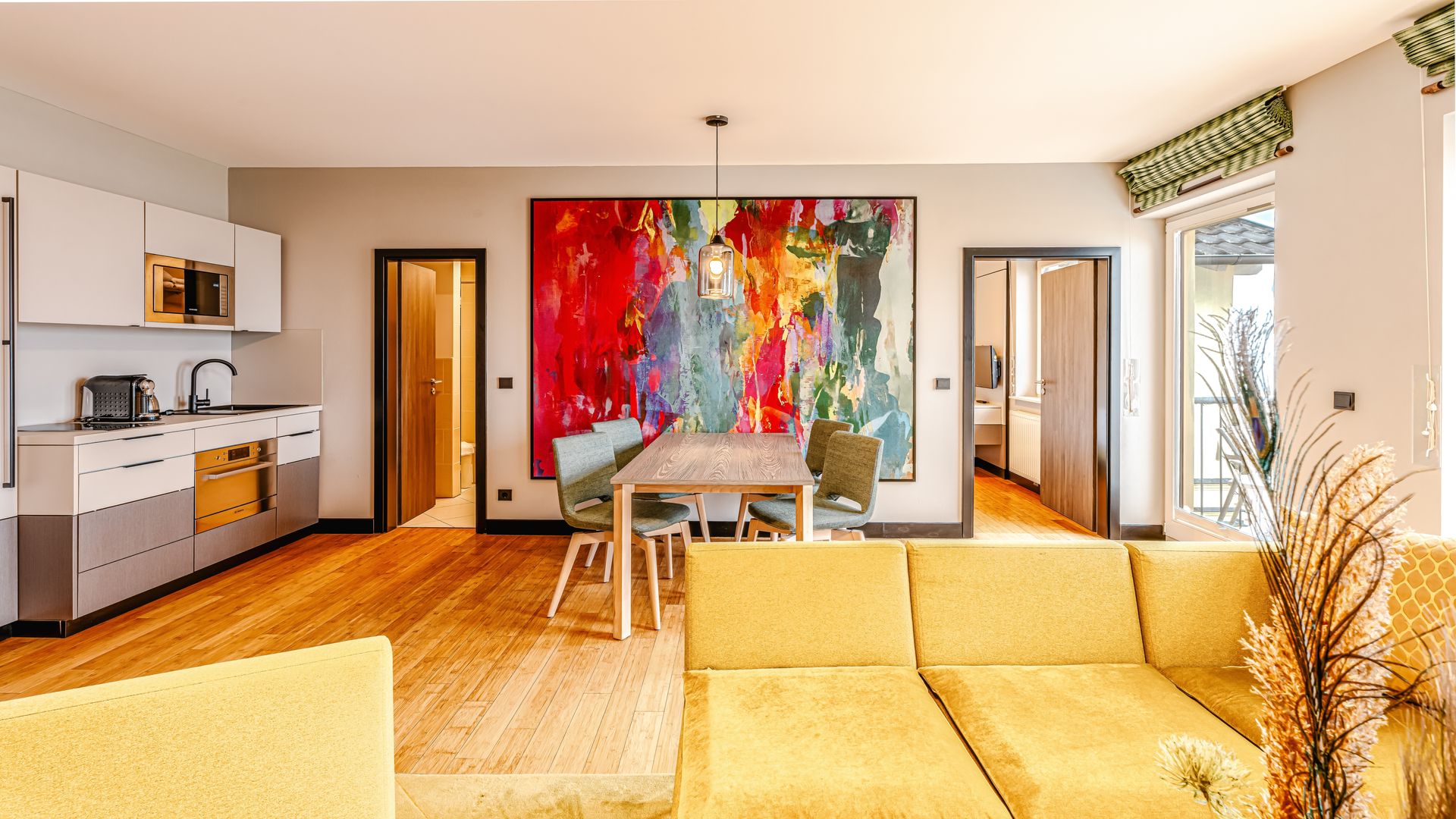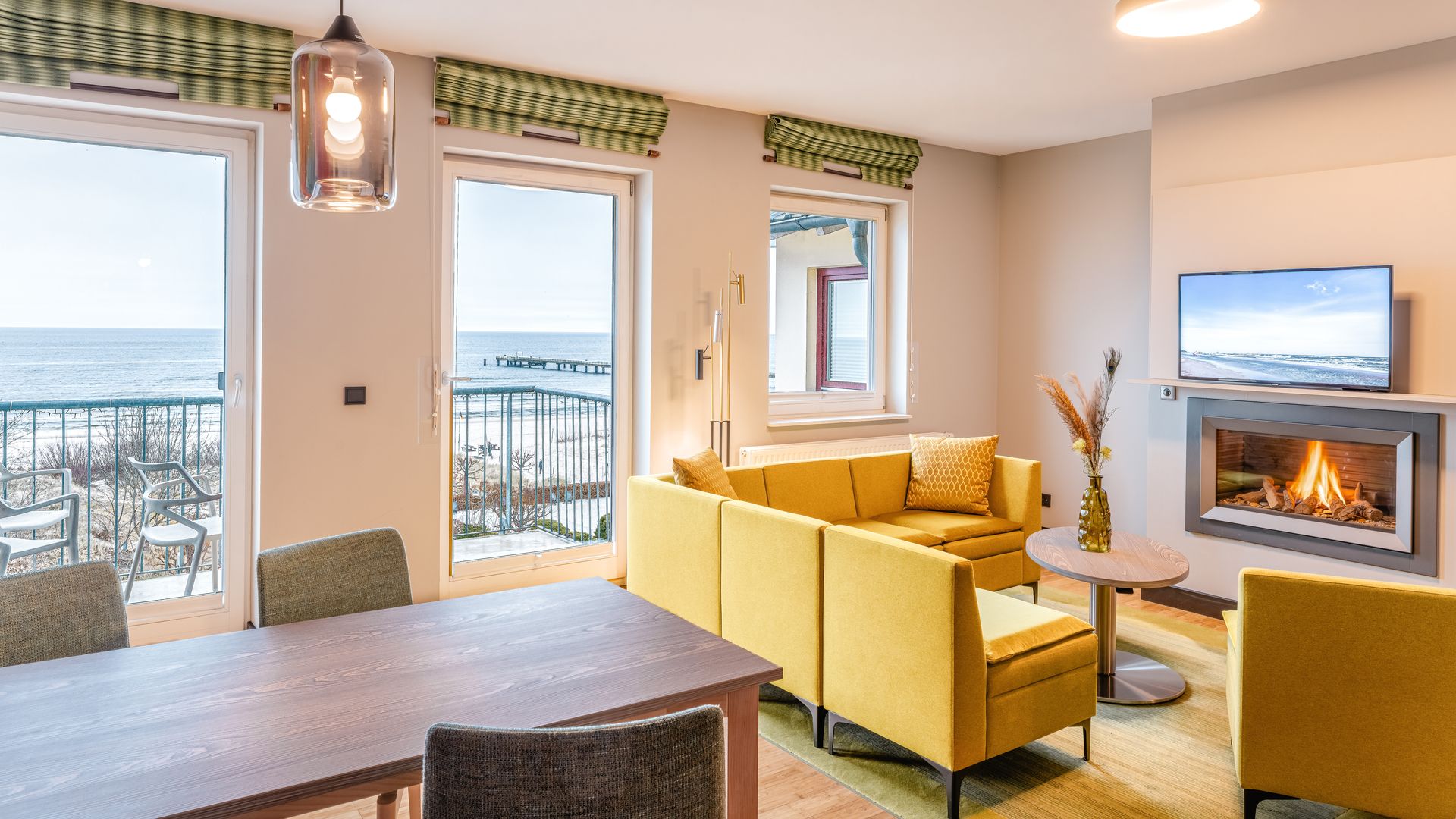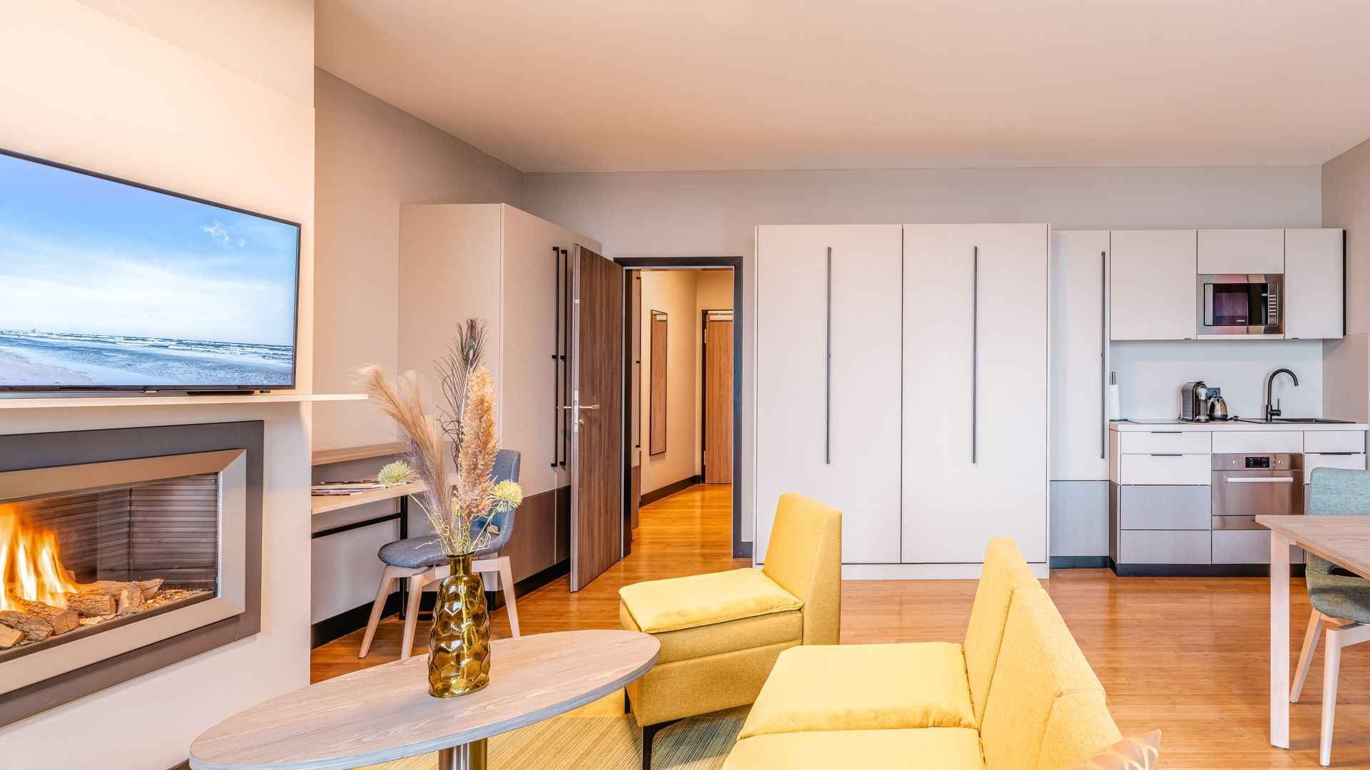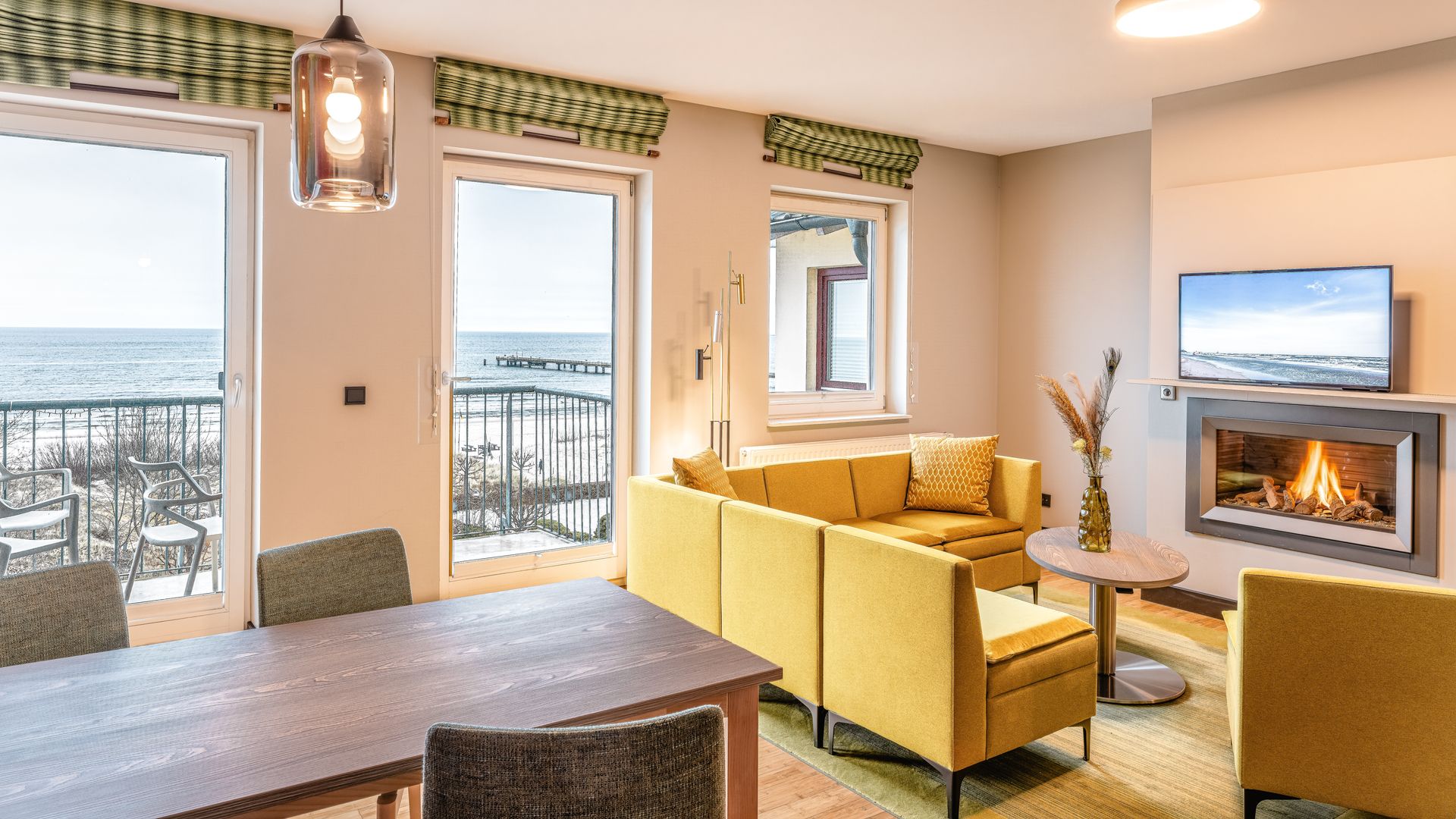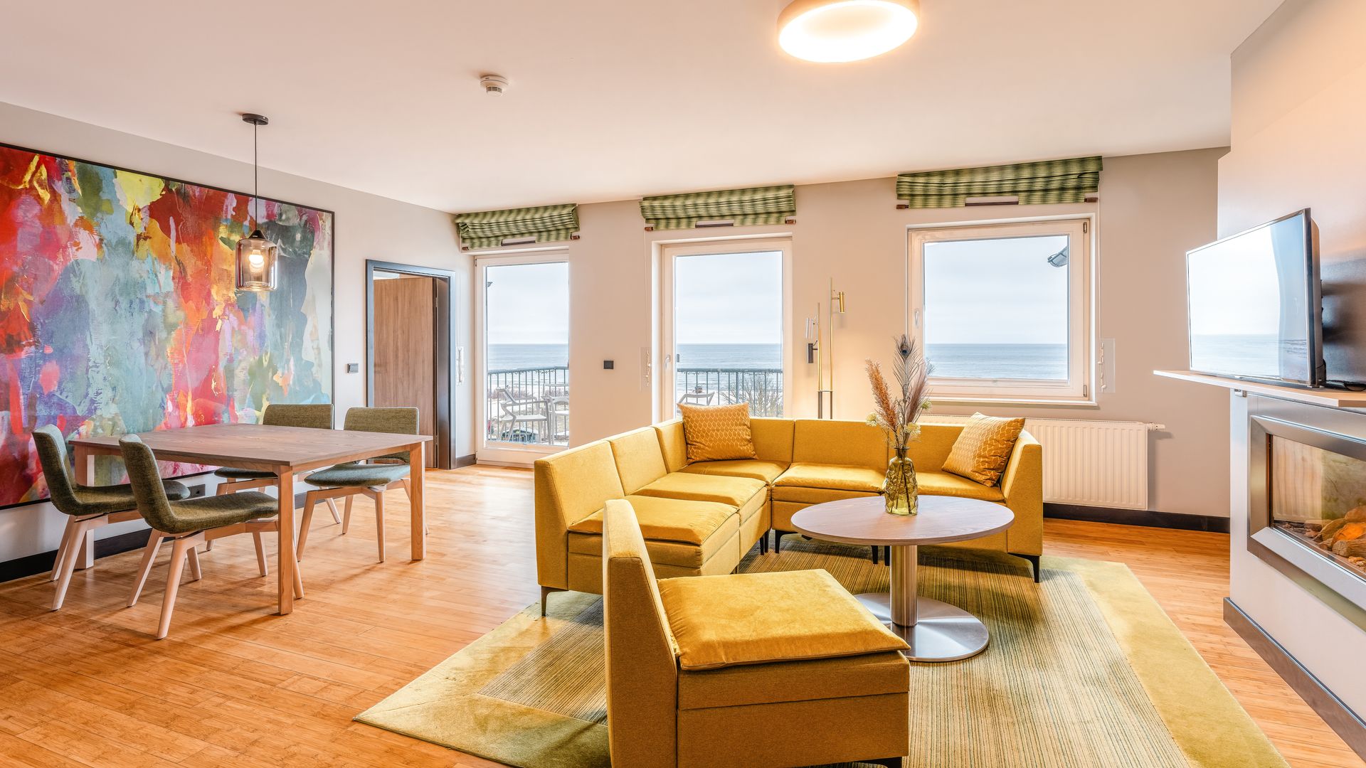 Ausstattung: Balkon mit Ostseeblick, Pantry-Küche mit Cerankochfeld, Mikrowelle, Geschirrspüler, Spüle und Geschirr, Kaffee- und Teestation mit Wasserkocher und Kapsel-Kaffeemaschine, Klimaanlage im Schlafzimmer, Gas-Kamin, Flat-TV, Minibar, Zimmersafe, kostenfreies WLAN, das Schlafzimmer mit Boxspringdoppelbett mit Leselampen hat ein nicht zu öffnendes Brandschutzfenster, zwei Schrankbetten, Bad mit Dusche/WC, separates Gäste-WC, Haarfön, Kosmetikspiegel, Babybett möglichBitte beachten Sie, dass aufgrund der Individualität unseres Hauses nur Zimmerbeispiele dargestellt sind. Sie haben die Möglichkeit, eine Zimmerkategorie zu buchen, jedoch keine Zimmervariante oder Zimmernummer. Details in der Ausstattung können abweichen. Ihre Wünsche versuchen wir selbstverständlich bei Verfügbarkeit zu erfüllen.